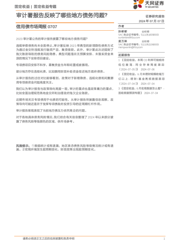 【天风证券】【20240707】信用债市场:审计署报告反映了哪些地方债务问题?-13页 行业研究