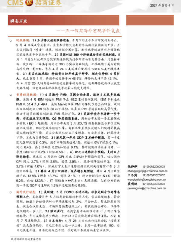 【海通证券】【20240504】五一假期海外宏观事件复盘:瞬息万变-16页 行业研究