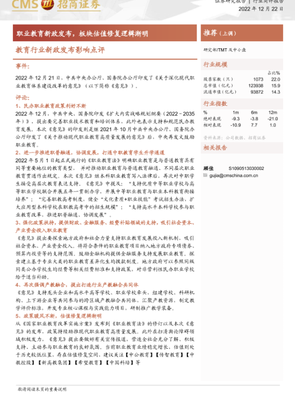 【海通证券】【20221222】教育行业新政发布影响点评:职业教育新政发布,板块估值修复逻辑渐明-3页 证券期货研究报告