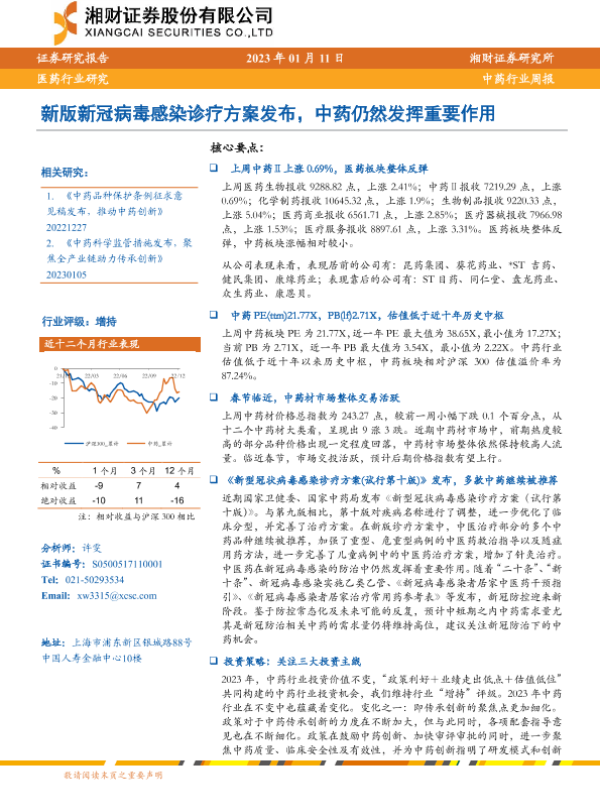 【湘财证券】【20230111】中药行业周报:新版新冠病毒感染诊疗方案发布,中药仍然发挥重要作用-12页 行业研究