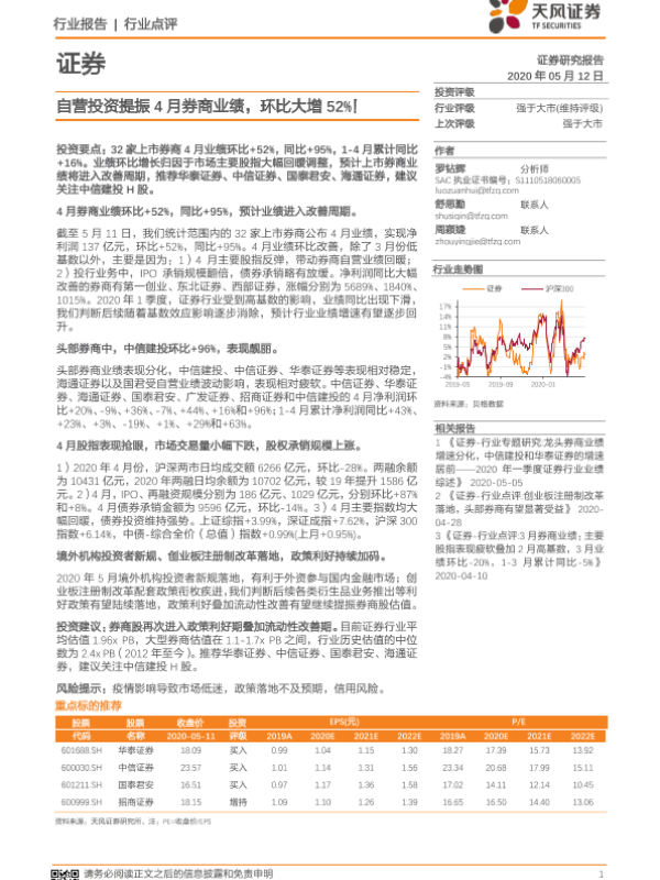 【天风证券】【20200512】自营投资提振4月券商业绩,环比大增52%-5页 行业研究