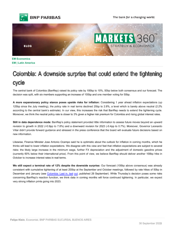 【BNP PARIBAS SUCURSAL BUENOS AIRES】【20220930】Colombia A downside surprise that could extend the tightening cycle-4页 行业研究