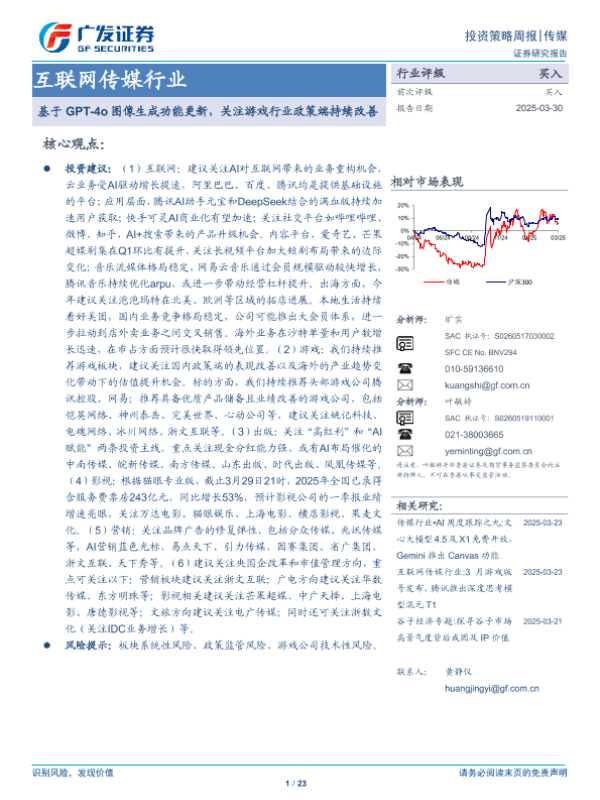 【广发证券】【20250330】互联网传媒行业:基于GPT-4o图像生成功能更新,关注游戏行业政策端持续改善-23页 证券期货研究报告