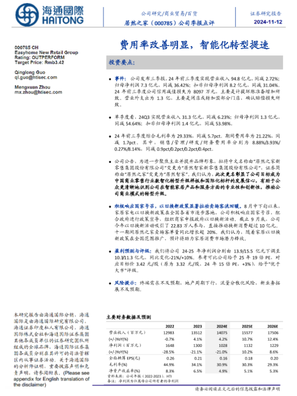 【海通国际】【20241112】居然之家(000785)公司季报点评:费用率改善明显,智能化转型提速-12页 行业研究