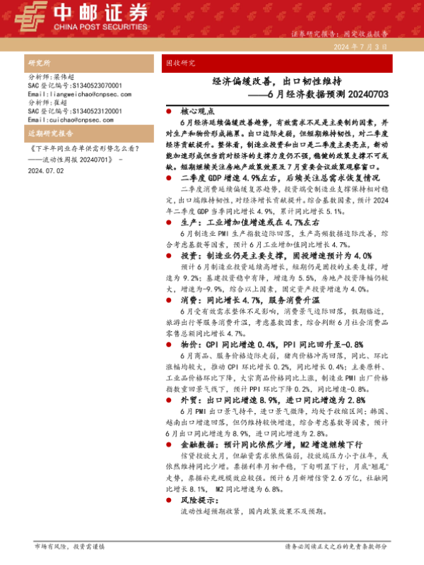 【中邮证券】【20240703】6月经济数据预测:经济偏缓改善,出口韧性维持-13页 行业研究