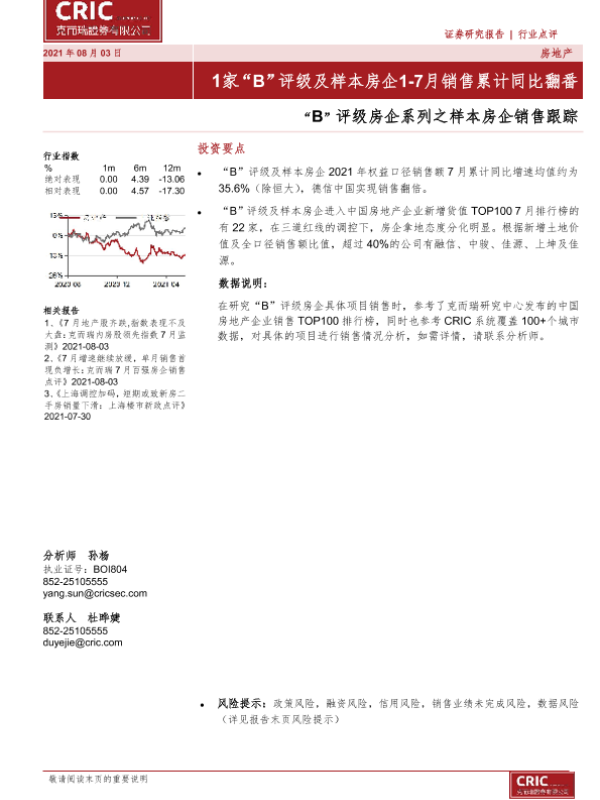 【克而瑞证券】【20210803】1家“B”评级及样本房企1-7月销售累计同比翻番-4页 行业研究