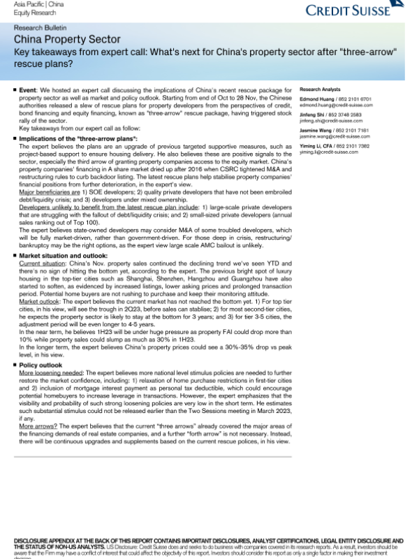 【Credit Suisse】【20221130】What's next for China's property sector after three-arrow rescue plans-4页 行业研究