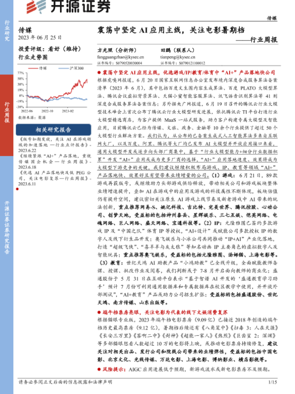 【开源证券】【20230625】传媒行业周报:震荡中坚定AI应用主线,关注电影暑期档-15页 行业研究
