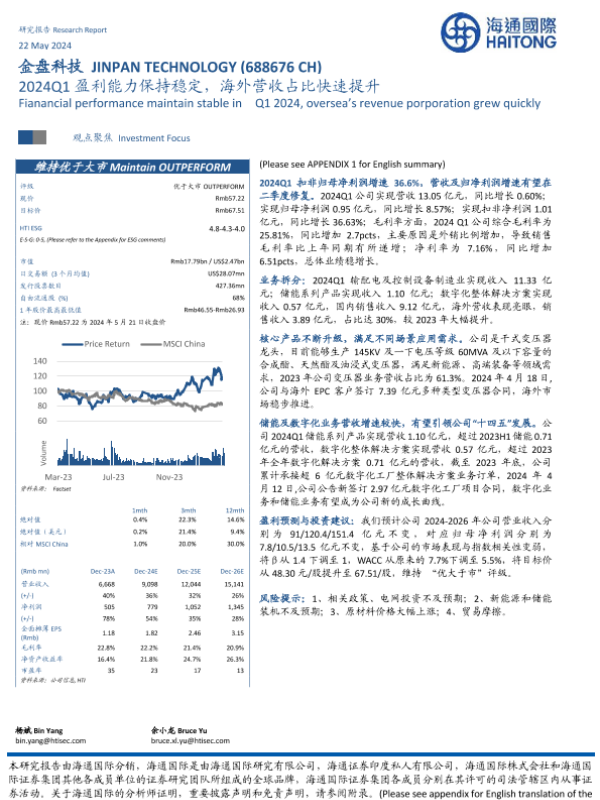 【海通国际】【20240522】金盘科技2024Q1盈利能力保持稳定,海外营收占比快速提升-12页 行业研究