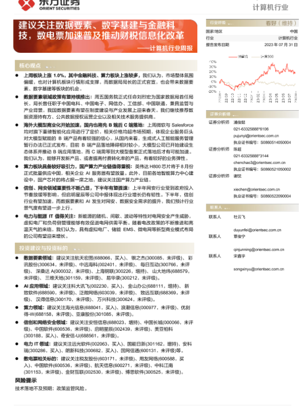 【东方证券】【20230731】20230731-东方证券-计算机行业周报:建议关注数据要素、数字基建与金融科技,数电票加速普及推动财税信息化改革-12页 行业研究