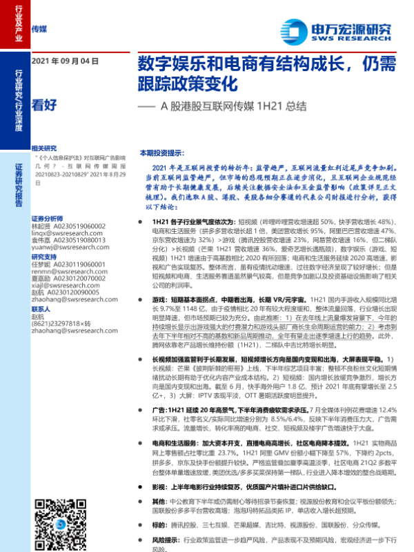 【申万宏源】【20210904】传媒行业:A股港股互联网传媒1H21总结,数字娱乐和电商有结构成长,仍需跟踪政策变化-43页 行业研究