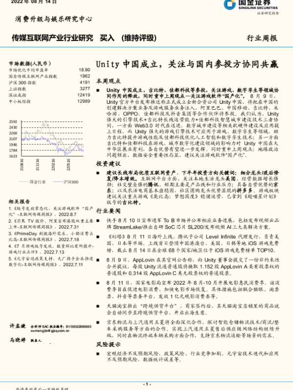 【国金证券】【20220814】传媒互联网产业行业研究:Unity中国成立,关注与国内参投方协同共赢-21页 行业研究