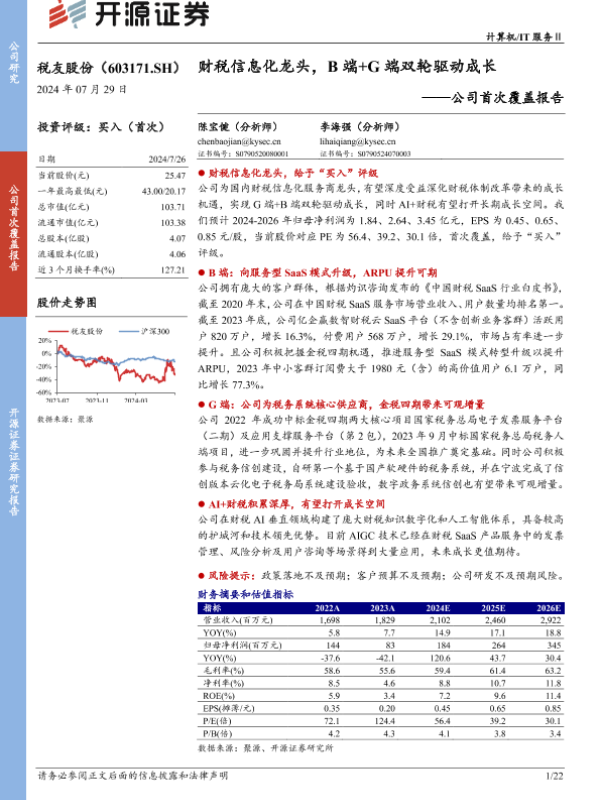 【开源证券】【20240729】税友股份-公司首次覆盖报告:财税信息化龙头,B端+G端双轮驱动成长-22页 公司研究