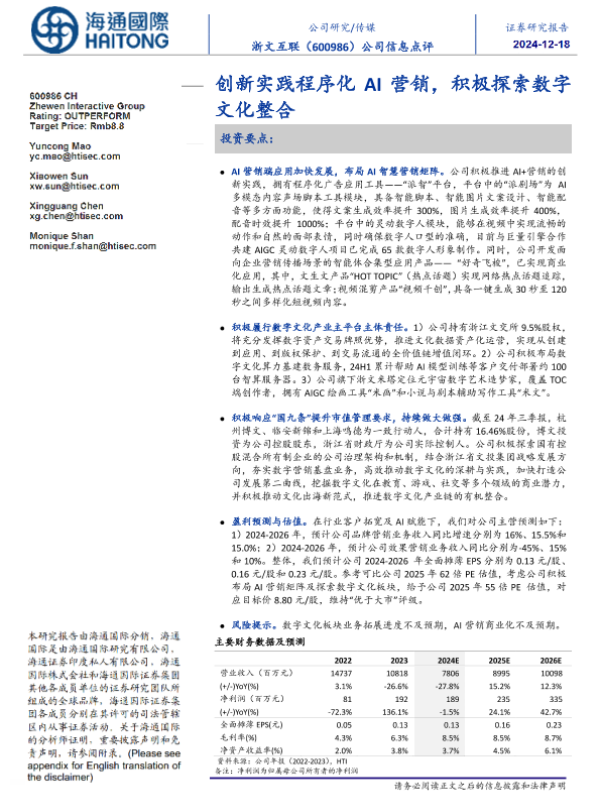 【海通国际】【20241218】浙文互联(600986)公司信息点评:创新实践程序化AI营销,积极探索数字文化整合-12页 行业研究