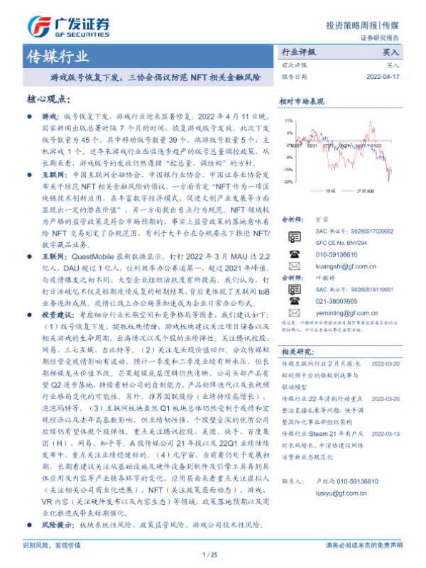 【广发证券】【20220417】游戏版号恢复下发,三协会倡议防范NFT相关金融风险-25页 行业研究