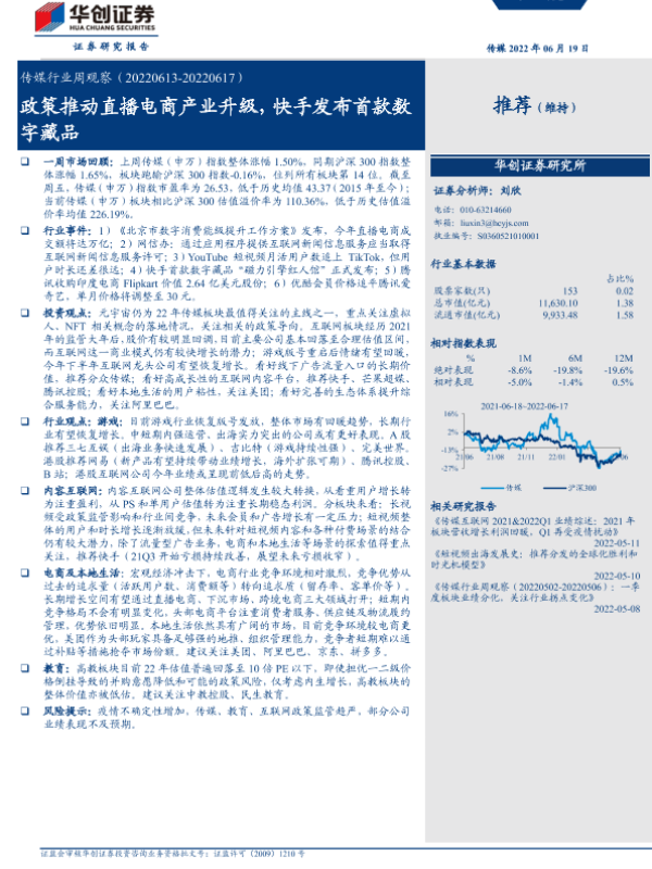 【华创证券】【20220619】传媒行业周观察:政策推动直播电商产业升级,快手发布首款数字藏品-23页 行业研究