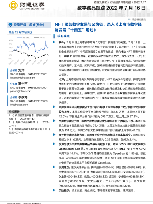 【财通证券】【20220717】旅游及景区行业投资策略周报:数字藏品跟踪-NFT服务数字贸易与区块链-11页 行业研究