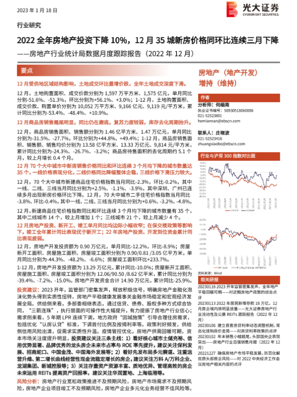 【光大证券】【20230118】2022全年房地产投资下降10%,12月35城新房价格同环比连续三月下降-17页 行业研究