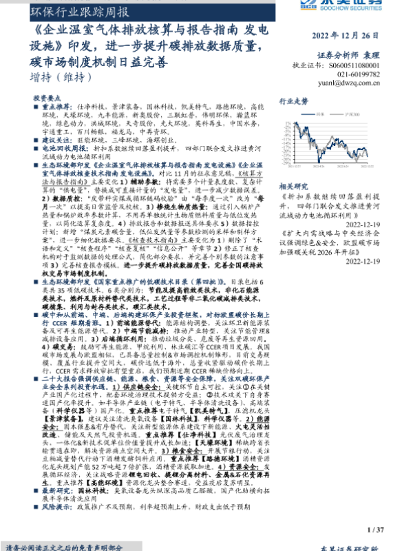 【东吴证券】【20221226】环保行业跟踪周报:《企业温室气体排放核算与报告指南 发电设施》印发,进一步提升碳排放数据质量,碳市场制度机制日益完善-37页 行业研究