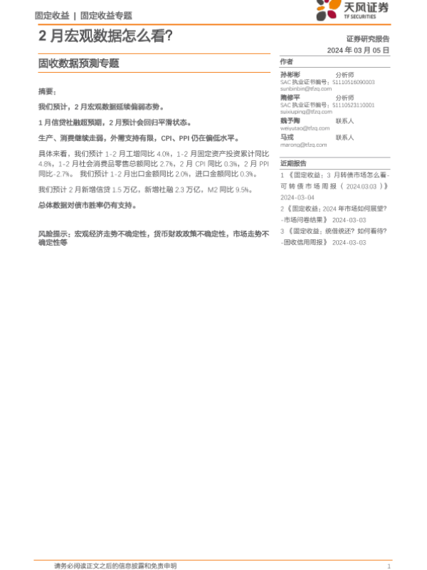 【天风证券】【20240305】固收数据预测专题:2月宏观数据怎么看?-22页 行业研究