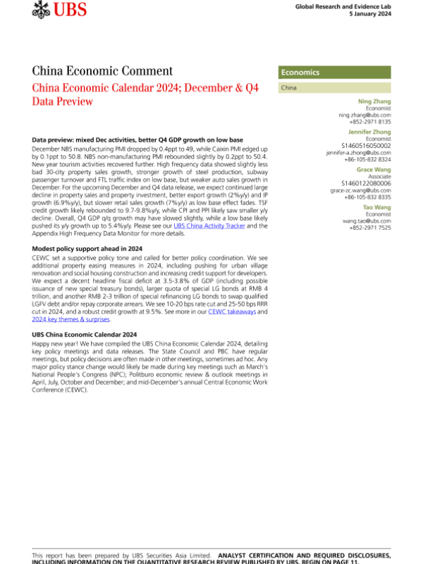 【UBS Securities Asia Limited】【20240105】UBS Economics-China Economic Comment China Economic Calendar 2024; December & Q4 Data Preview-14页 行业研究