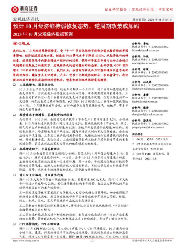 【浙商证券】【20231101】2023年10月宏观经济数据预测:预计10月经济维持弱修复态势,逆周期政策或加码-21页 行业研究