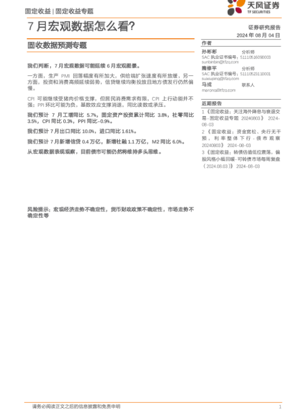 【天风证券】【20240804】固收数据预测专题:7月宏观数据怎么看?-19页 行业研究