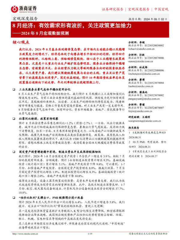 【浙商证券】【20240902】2024年8月宏观数据预测-8月经济:有效需求形有波折,关注政策更加给力-19页 行业研究