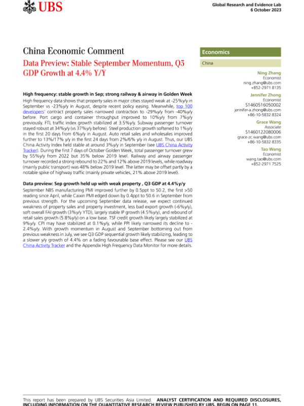 【UBS Securities Asia Limited】【20231006】Data Preview Stable September Momentum, Q3 GDP Growth at 4.4% Y/Y-14页 行业研究