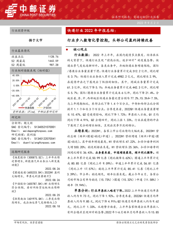 【中邮证券】【20220902】快递行业2022年中报总结:行业步入数智化管控期,头部公司盈利持续改善-26页 行业研究
