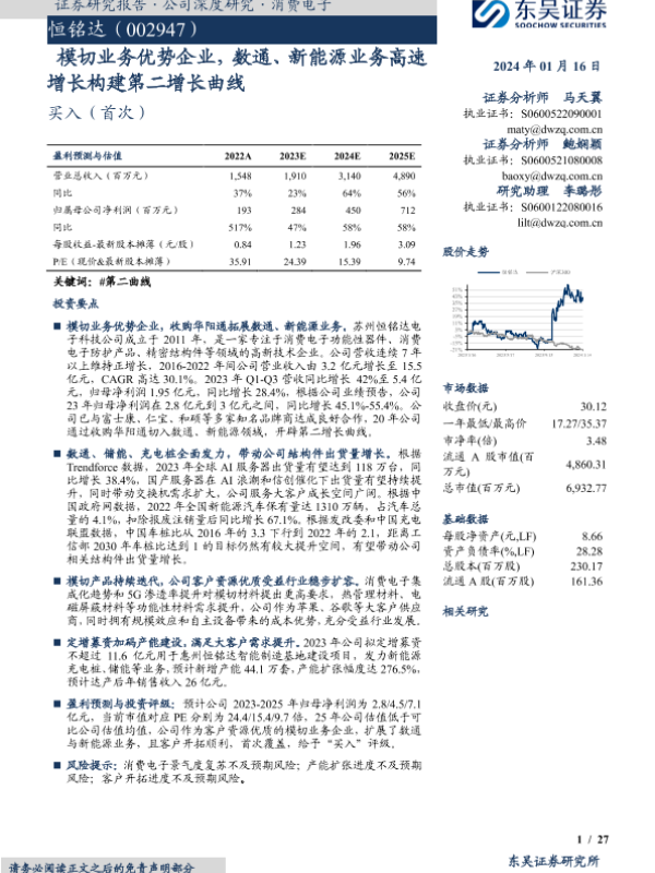 【东吴证券】【20240116】恒铭达:模切业务优势企业,数通、新能源业务高速增长构建第二增长曲线-27页 行业研究