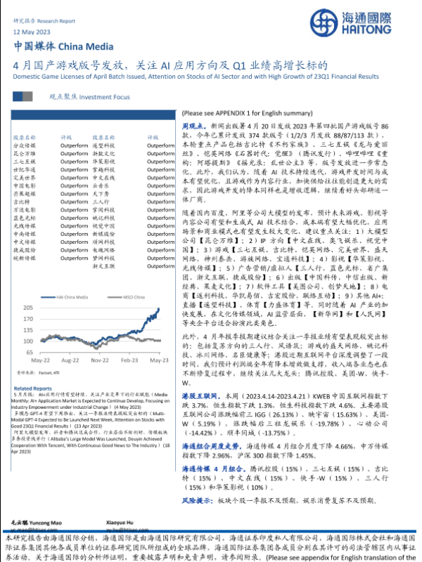 【海通国际】【20230512】中国媒体:4月国产游戏版号发放,关注AI应用方向及Q1业绩高增长标的-19页 行业研究