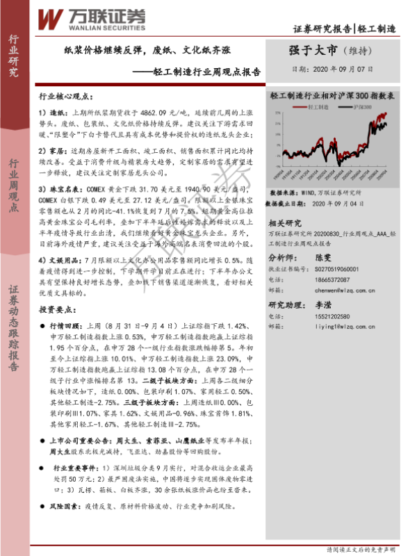 【万联证券】【20200907】20200907-万联证券-轻工制造行业周观点报告:纸浆价格继续反弹,废纸、文化纸齐涨-10页 行业研究
