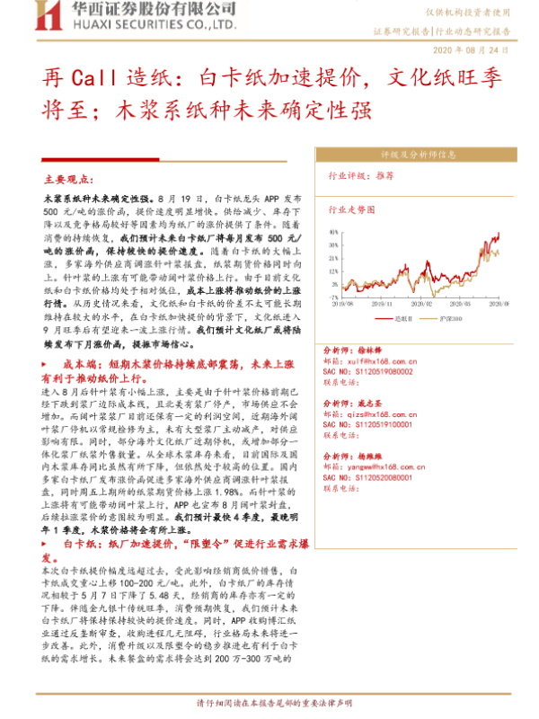 【华西证券】【20200824】再Call造纸:白卡纸加速提价,文化纸旺季将至;木浆系纸种未来确定性强-13页 行业研究