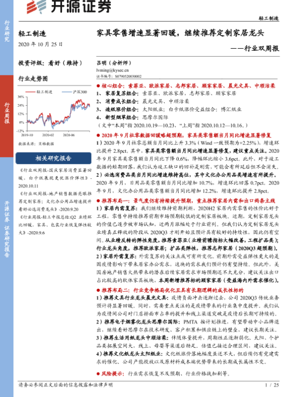 【开源证券】【20201025】轻工制造行业双周报:家具零售增速显著回暖,继续推荐定制家居龙头-25页 行业研究