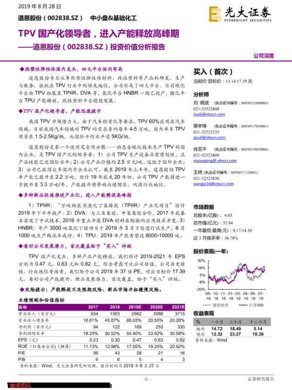 【光大证券】【20190828】道恩股份-002838.SZ-投资价值分析报告:TPV国产化领导者,进入产能释放高峰期-33页 行业研究