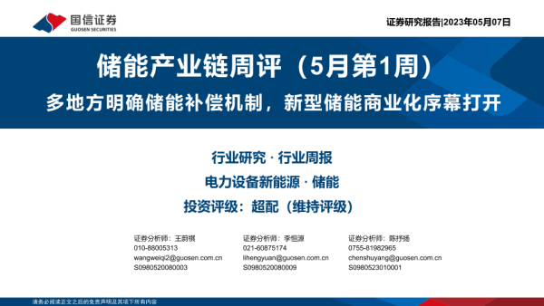 【国信证券】【20230507】储能产业链周评(5月第1周):多地方明确储能补偿机制,新型储能商业化序幕打开-28页 行业研究