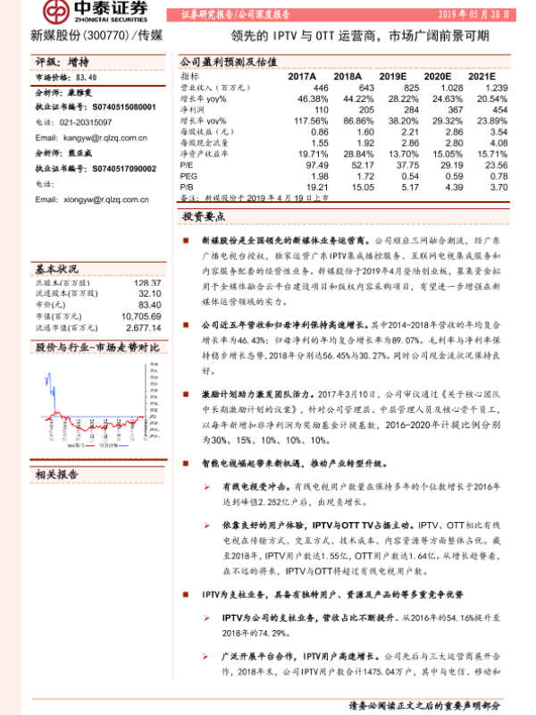 【中泰证券】【20190528】20190528-中泰证券-新媒股份-300770.SZ-领先的IPTV与OTT运营商,市场广阔前景可期-27页 行业研究