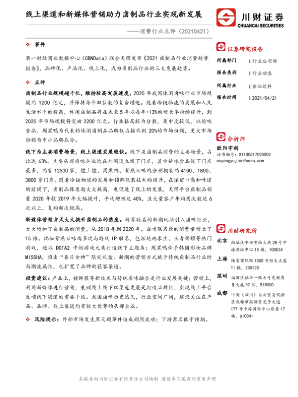 【川财证券】【20210421】消费行业点评:线上渠道和新媒体营销助力卤制品行业实现新发展-2页 行业研究