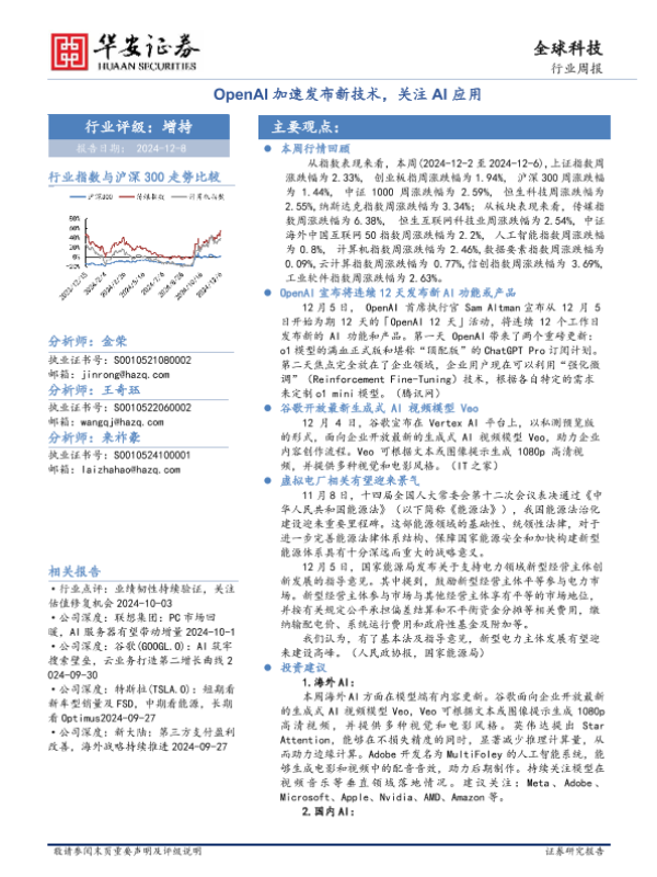 【华安证券】【20241208】全球科技行业周报:OpenAI加速发布新技术,关注AI应用-27页 行业研究