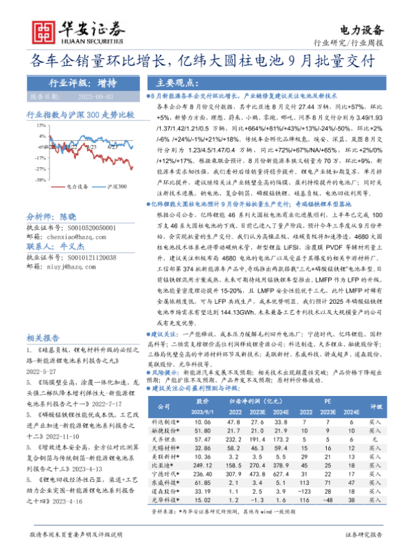 【华安证券】【20230903】电力设备行业周报:各车企销量环比增长,亿纬大圆柱电池9月批量交付-30页 行业研究