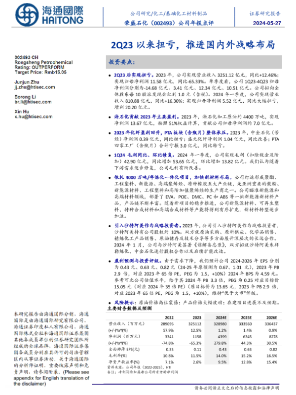 【海通国际】【20240527】荣盛石化(002493)2Q23以来扭亏,推进国内外战略布局-14页 行业研究