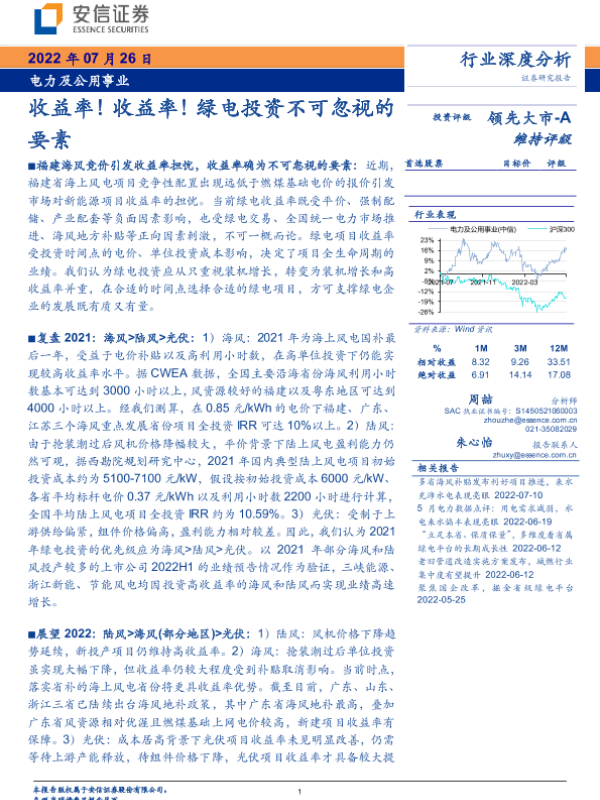 【安信证券】【20220726】电力及公用事业行业:收益率!收益率!绿电投资不可忽视的要素-27页 行业研究