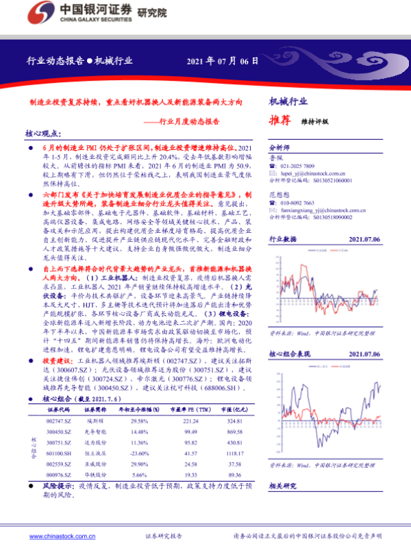 【银河证券】【20210706】机械行业月度动态报告:制造业投资复苏持续,重点看好机器换人及新能源装备两大方向-29页 行业研究
