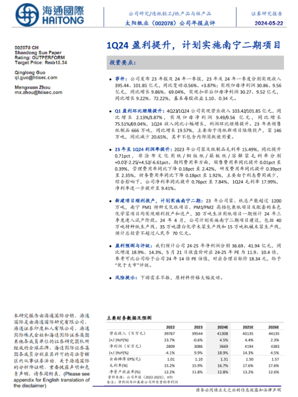 【海通国际】【20240522】太阳纸业(002078)1Q24盈利提升,计划实施南宁二期项目-11页 行业研究