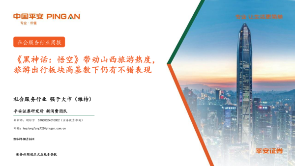 【平安证券】【20240826】社会服务行业周报:《黑神话:悟空》带动山西旅游热度,旅游出行板块高基数下仍有不错表现-11页 行业研究