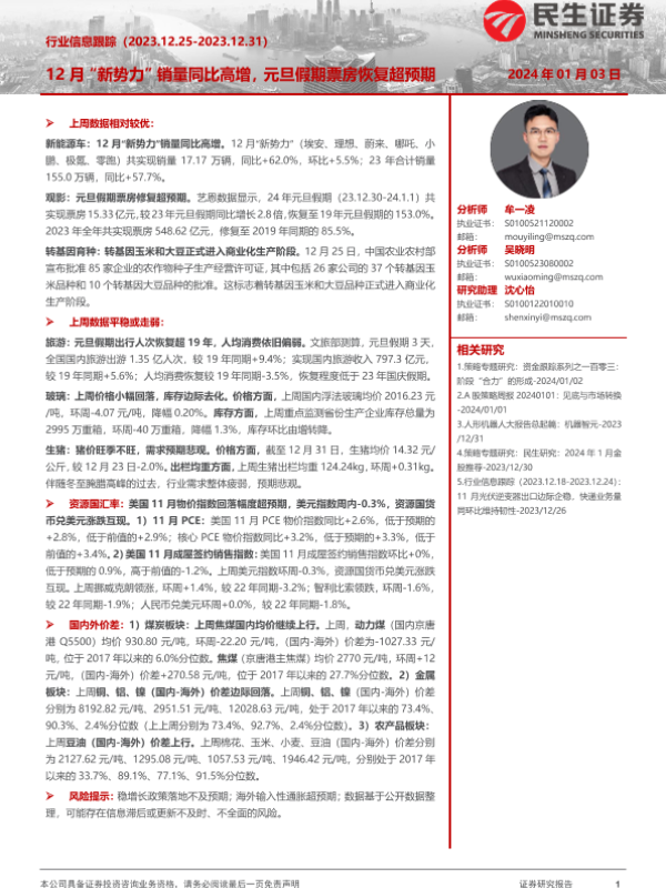 【民生证券】【20240103】行业信息跟踪:12月“新势力”销量同比高增,元旦假期票房恢复超预期-30页 行业研究