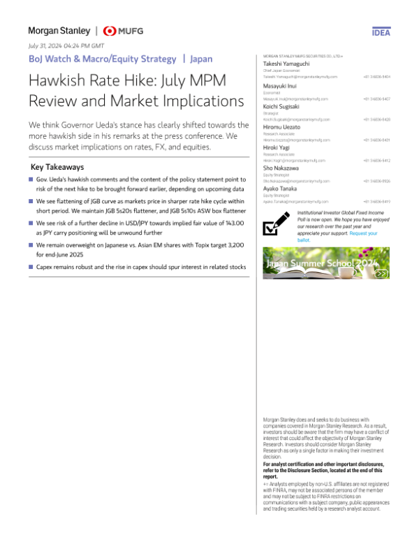 【Morgan Stanley】【20240731】Morgan Stanley Fixed-BoJ Watch MacroEquity Strategy Hawkish Rate Hike July MPM Review and Market Implications-22页 行业研究