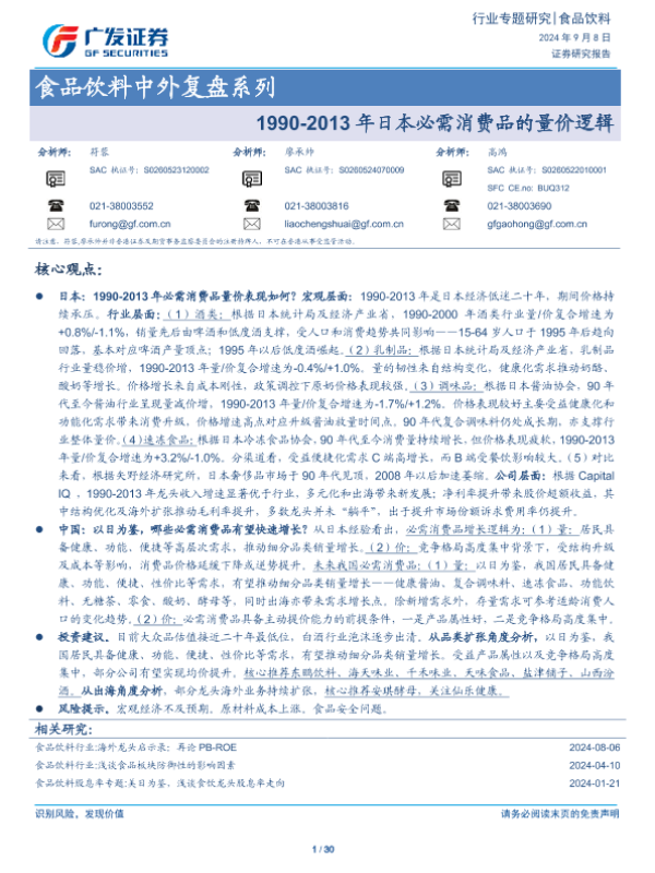 【广发证券】【20240908】食品饮料行业中外复盘系列:1990-2013年日本必需消费品的量价逻辑-30页 行业研究