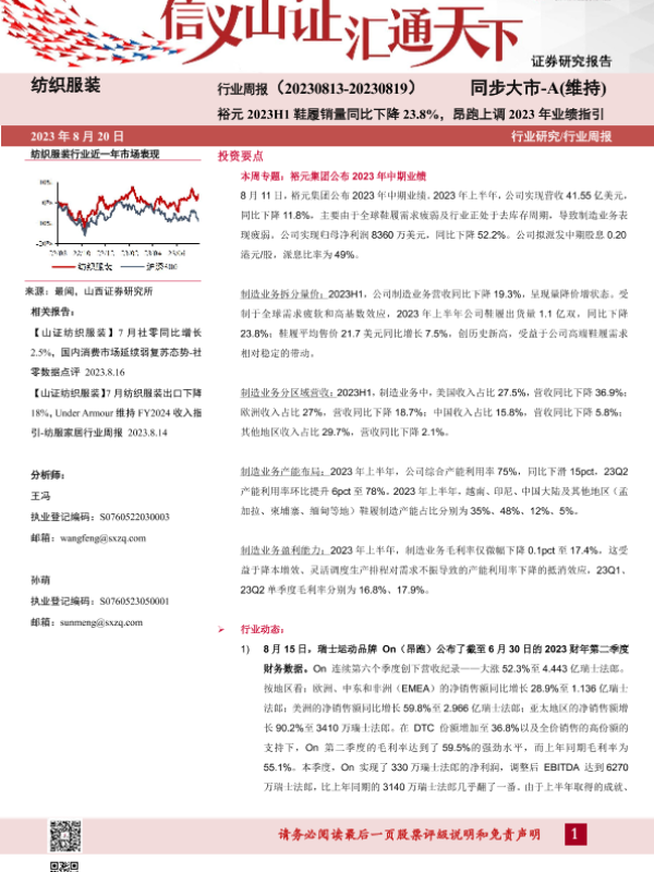 【山西证券】【20230820】纺织服装行业周报:裕元2023H1鞋履销量同比下降23.8%,昂跑上调2023年业绩指引-24页 行业研究
